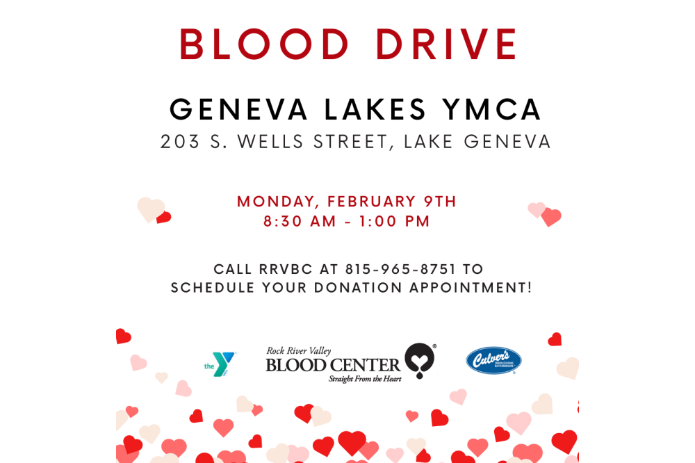 Donate blood at the YMCA on Monday, February 9th from 8:30 am - 1:00 pm. All donors will receive a certificate for a pint of Culver's custard! Please bring a photo ID and make sure to eat & drink plenty before your donation. Call RRVBC at 815.965.8751 to schedule your appointment. Walk-ins welcome and will be accommodated as schedule allows. RRVBC is the only blood supplier of blood for your Mercyhealth Hospital