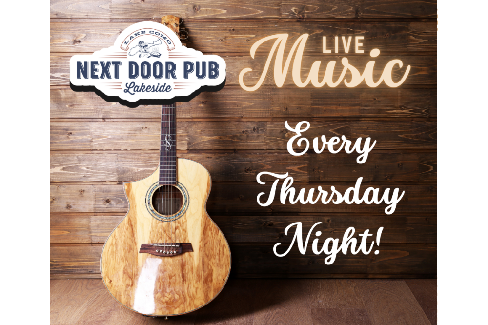 Join us every Thursday at Next Door Pub Lakeside for good vibes, great eats, and your favorite tunes with a Lake Como view. Bring the crew, grab a table, and make it a weekly thing!Thursday perks to pair with the music: