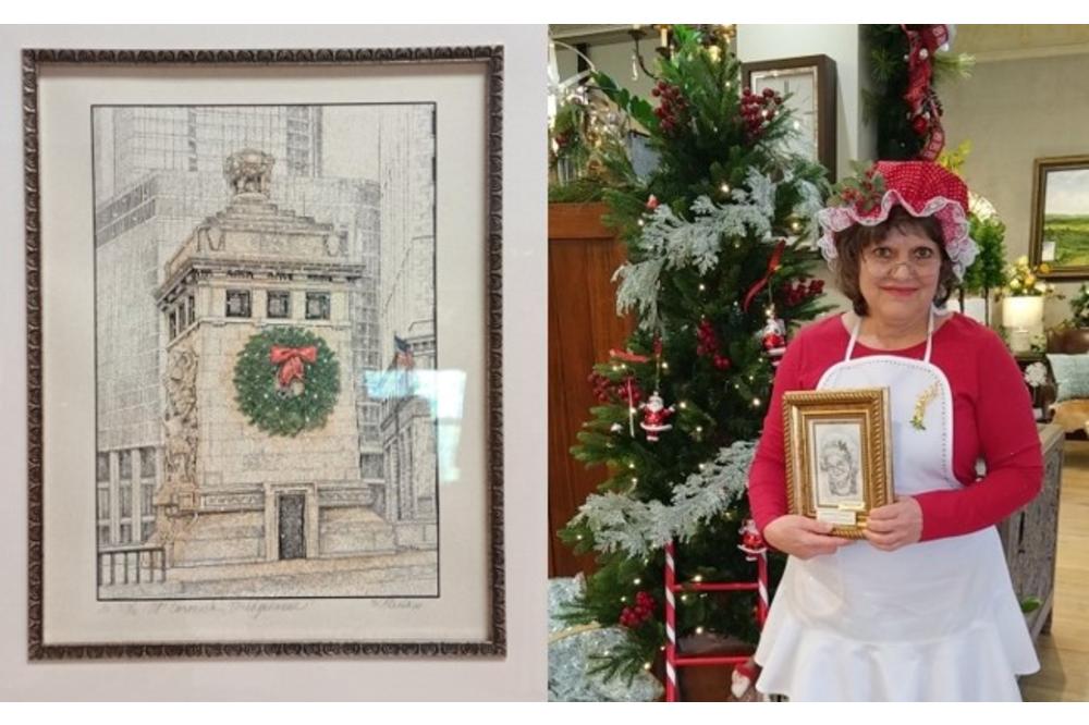 Marla studied art abroad in Florence, Rome, Paris, and London—experiences that shaped her appreciation for architecture and design. Now based in Chicago, Marla draws inspiration from the city’s rich history and iconic landmarks, capturing beloved sites such as Marshall Field’s at Christmas. A former commercial illustrator for national brands including Coca-Cola and McDonald’s, her pen and ink drawings are tinted with watercolors and celebrate Chicago’s heritage and holiday spirit.