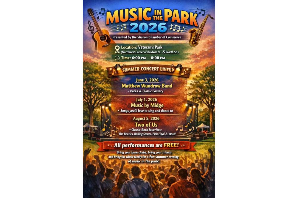 The Village of Sharon & The Sharon Chamber of Commerce are proud to present various musical artists the 1st Wednesday of every month, June - August.