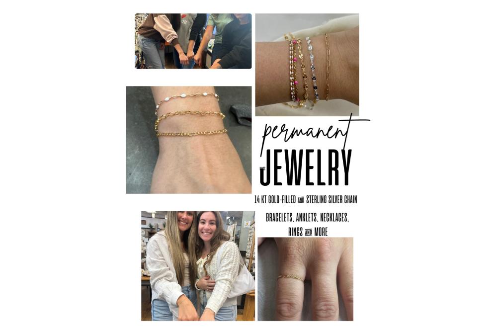 Come get a permanent bracelet, anklet or necklace. Tarnish-resistant 14k gold filled & sterling silver chains and connectors! A perfect way to commemorate a milestone or just something to do to with one of your besties - we think permanent jewelry is just plain fun. And pretty. So, so pretty!