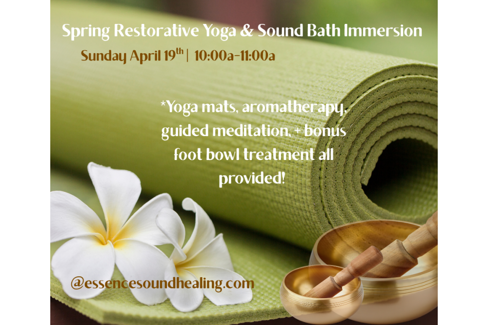 APRIL 19TH SPRING RESTORATIVE YOGA & IMMERSIVE SOUND BATH 10A-11A AT ESSENCE SOUND HEALING. Yoga mats, aromatherapy, eye pillows, blankets, bolsters all provided. Total cost: $40.00 per person