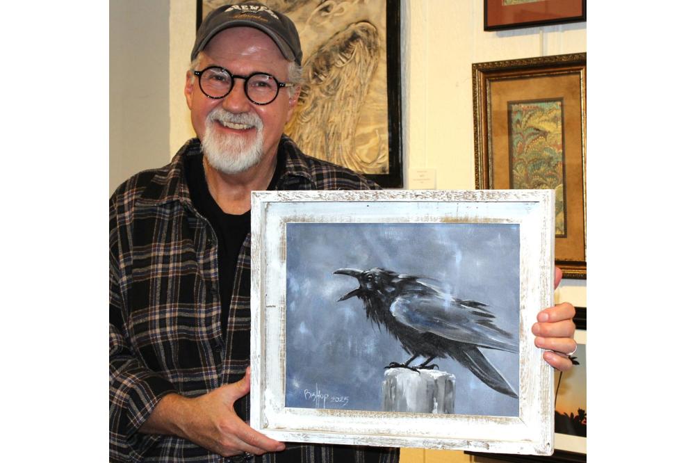 Members of the Geneva Lake Arts Foundation, which owns and operates the gallery, have produced pieces in such media as painting, drawing, photography, pottery, glass, jewelry, sculpture, mixed media, weaving, fiber, and wood. Billy Bishop has works of art in the Winter Show. In the image above he is holding his 11x14-inch acrylic painting titled “Cold.”